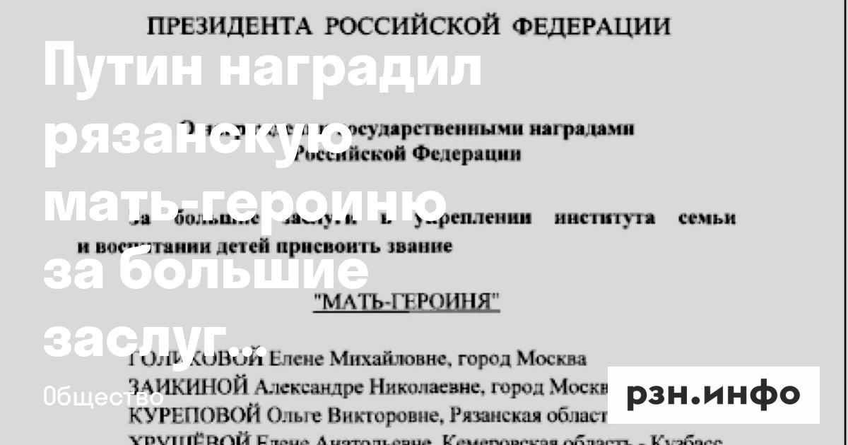 Владимир Путин наградил рязанскую мать-героиню за большие заслуги в укреплении института семьи и воспитании детей. Соответствующий документ разместили на официальном сайте правовых актов.