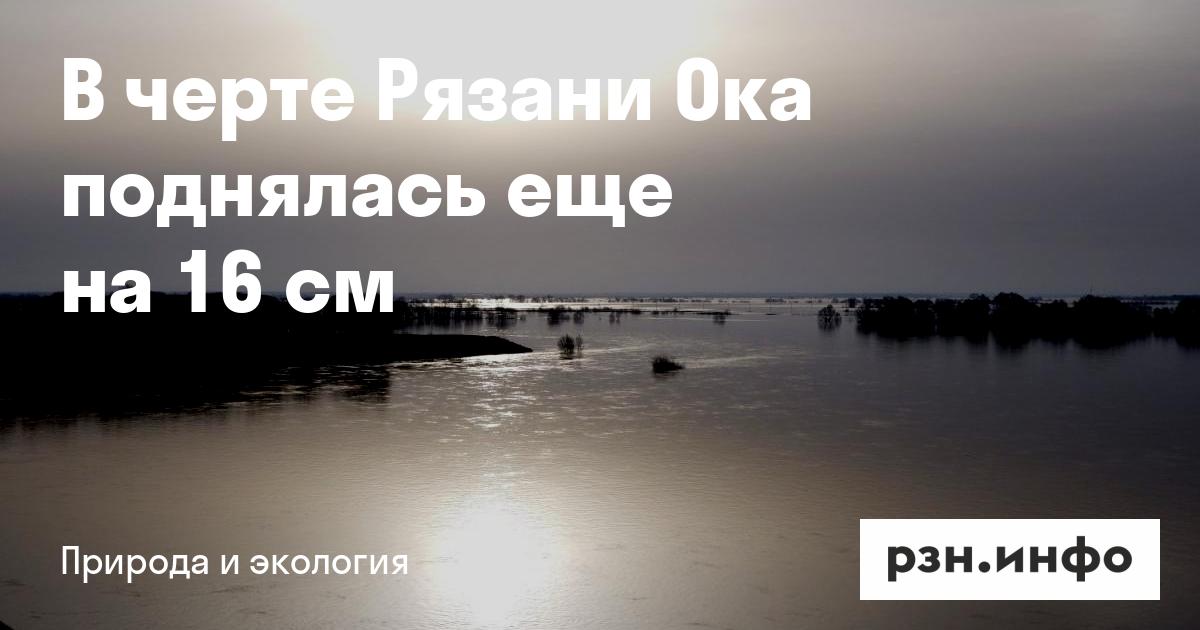 За сутки в Оке в черте Рязани уровень воды повысился на 16 см. Он составляет 98 см выше нулевой отметки гидрологического поста. В области ситуация следующая: в Оке в районе села Старая Рязань уровень воды повысился на 15 см (уровень составляет 173 см выше нулевой отметки гидрологического поста); в Оке в районе Касимова — +6 см (уровень — 156 см); в Мокше в черте рабочего поселка Кадом — +5 см (215 см); в Проне в черте деревни Быково Кораблинского района — +11 см (216 см); в реке Ранова в районе села Троица — +12 см (331 см); в Верде у Скопина — +4 см (157 см).