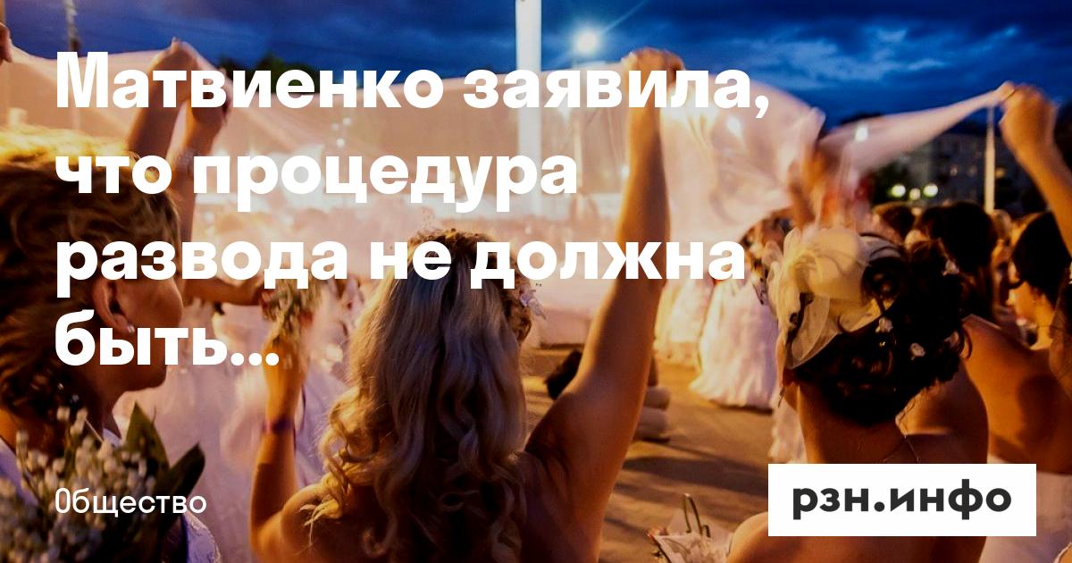 Председатель Совфеда Валентина Матвиенко на III Всероссийском муниципальном форуме «Малая Родина — сила России» выразила мнение, что процедура развода в России не должна быть слишком простой, особенно, если в семье есть дети. Ее слова 20 апреля передало ТАСС. Матвиенко привела в пример страны Запада, где процедура развода занимает минимум два года. «У нас пришли, написали заявление, двое-трое детей. И свободны. Так не может быть, так не должно быть», — сказала Матвиенко.