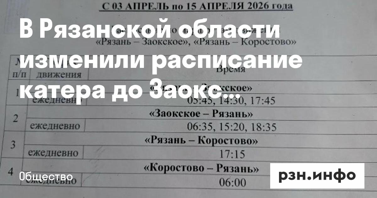 В Рязанской области изменили расписание катера до Заокского и Коростово с 3 по 15 апреля. Об этом сообщили на странице «ВКонтакте» «Заокский ДК Рязанского округа».